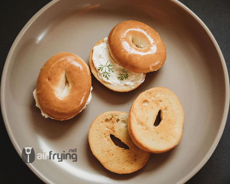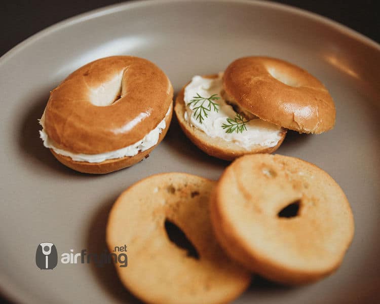 Bagels are yeasted wheat dough and are briefly boiled in water before being baked. The holes are actually functional as bagels historically have been slid down dowel rods to make them easier to transport and aesthetically pleasing. Yet another bagel fact that I just learned – thank you, Wikipedia. Many people prefer their bagels toasted but since I am writing this on an air frying website, let’s air fry this bagel!