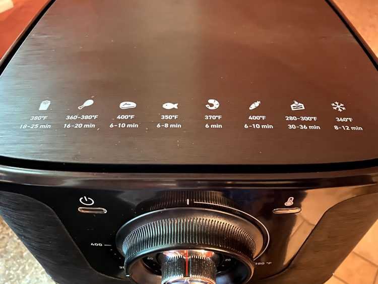 I’ll be perfectly honest – I didn’t open the user manual until I sat down to write this post. Because the unit is so similar to the Cosori premium 5.8 quart air fryer we already have, it’s was easy just to dive in. More importantly, with the only inputs a knob for time and a dial for temperature, anyone could work this air fryer without prior knowledge of it.