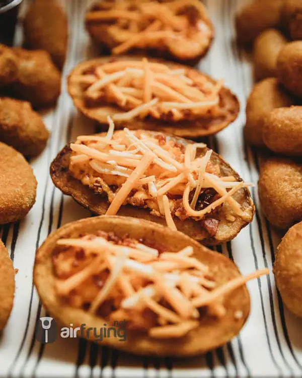 Air fry for 5 minutes at 370° F | 187° C. Add an additional 1-2 minutes or so if you have exceptionally large frozen potato skins.
